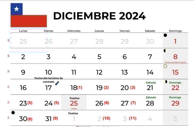 Volviendo al ejemplo, hay que sumarle la cantidad de 6 días inhábiles correspondientes a sábados, domingos y festivos que resultan entre el 17 de diciembre de 2024 y el 3 de enero de 2025: