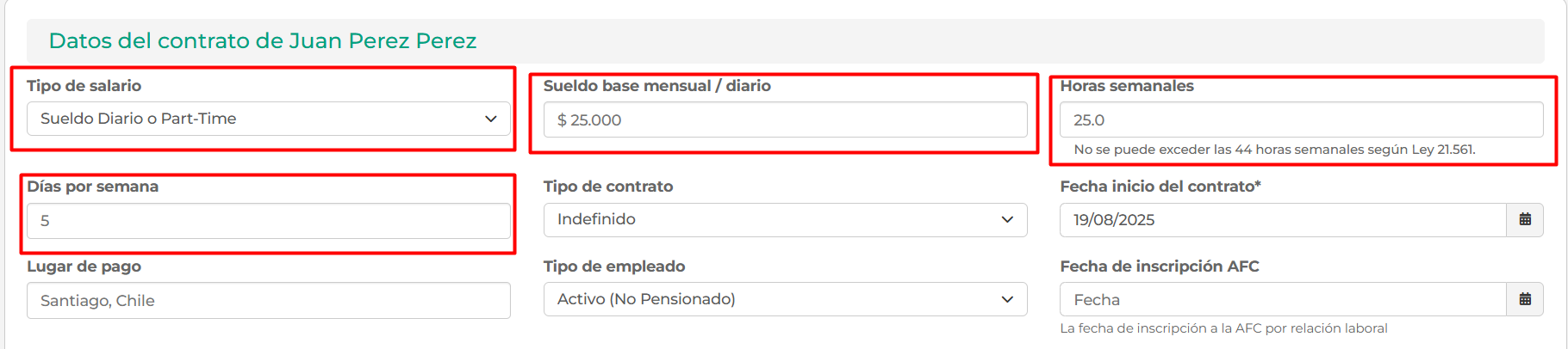 Ejemplo: tenemos un trabajador Part-Time que trabaja 5 días por semana, 5 horas diarias (25 semanales) y tiene un sueldo diario de $25.000. Consideremos que el porcentaje de hora extra es 50%.