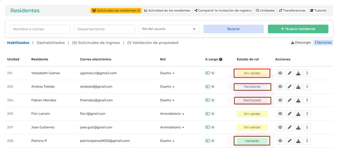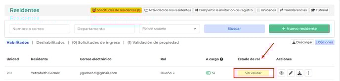 • Rol sin validar: El residente aún no ha adjuntado la documentación (documento de identidad y titulo de propiedad).