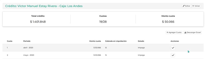 Una vez creado nos mostrará la información del crédito creado y cómo será descontado en la liquidación y pagados en la plataforma.