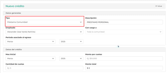- Seleccionamos en Tipo la opción Préstamo de la comunidad