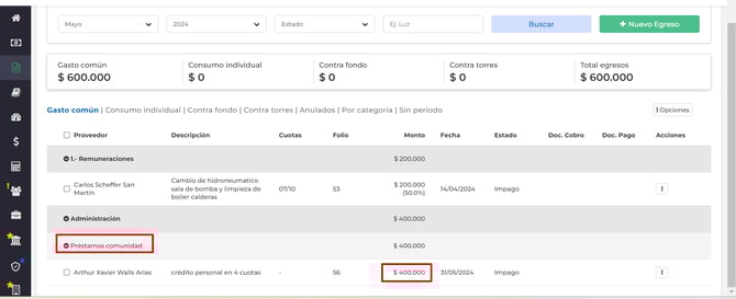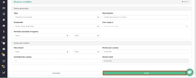 Finalmente en el módulo de egresos nos mostrará el valor del crédito que se le pagará al usuario.