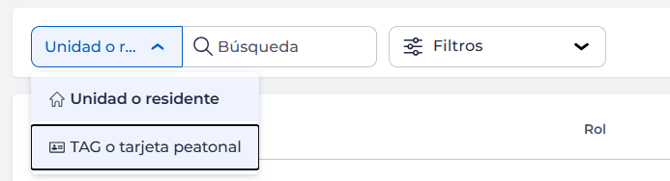 Configura el Filtro: En la barra de búsqueda superior, haz clic en el menú desplegable (por defecto dice "Unidad o Residente").