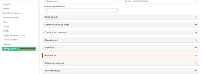 2) Una vez allí, debemos ir a la sección de Configuración y ubicar la opción de Residentes. Le damos clic y se desplegarán una lista de opciones