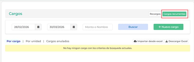 En la esquina superior derecha, encontrarás un botón de color verde "Cargos Recurrentes"