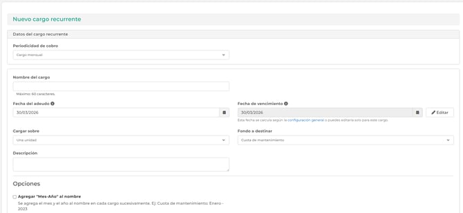 Se agregó la funcionalidad de crear cargos recurrentes en el sistema para facilitar y agilizar la configuración de los cargos de la comunidad. Esto permitirá realizar la cobranza de forma automática.