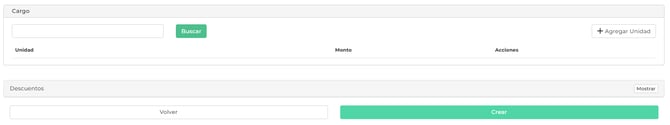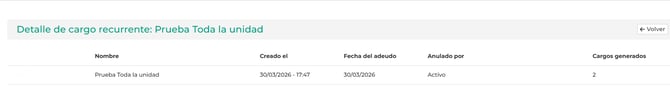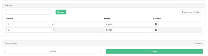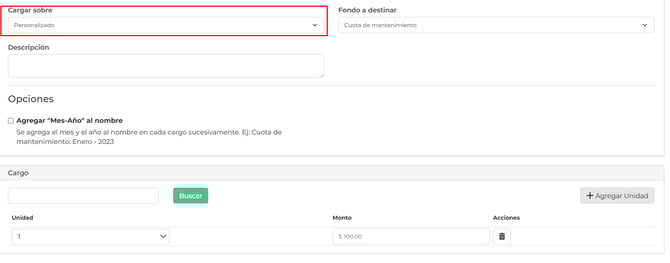 Al momento de elegir cargar sobre "UNA UNIDAD" o "PERSONALIZADO" se habilita una sección que dice "CARGO" donde podrá agregar las unidades a las que se le aplicara el cargo recurrente, con e monto correspondiente a pagar.