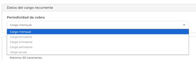 - Periodicidad de cobro: Puedes elegir entre diferentes períodos de cobro para el cargo, como: mensual, bimestral, trimestral, semestral y anual.
