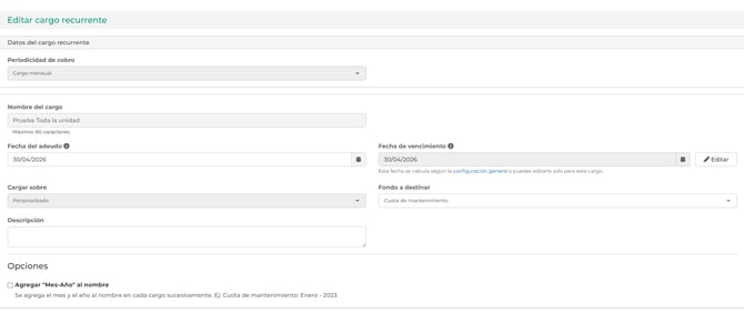 - Fondo a asignar: Selecciona si el cargo se destinará a la cuota de mantenimiento o a algún fondo específico creado.