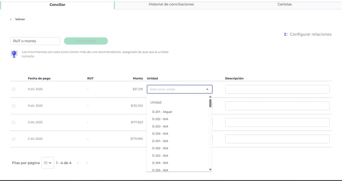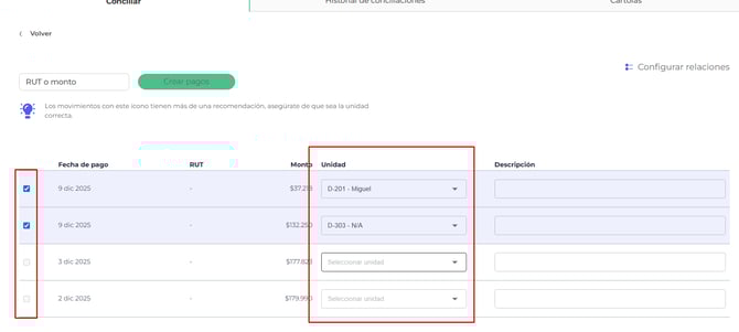 Verifique las unidades sugeridas por el sistema. Si bien el software propone unidades en base a montos exactos, es importante confirmar que correspondan al pago correcto.