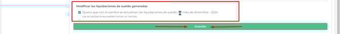 - Si las liquidaciones de sueldo del mes están creadas, debe guardadas los cambios, haz clic en el cuadro donde se visualiza el mensaje "Quiero que con le cambio se modifiquen las liquidaciones del sueldo" como te mostramos en la imagen y guarda.