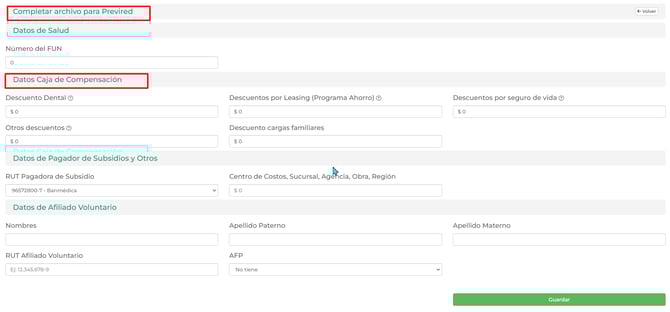 - Tendremos las distintas opciones para hacer los descuentos según corresponda. Para que el descuento se informe en el archivo de Previred en la sección de la caja de compensación y por último le damos clic en Guardar.