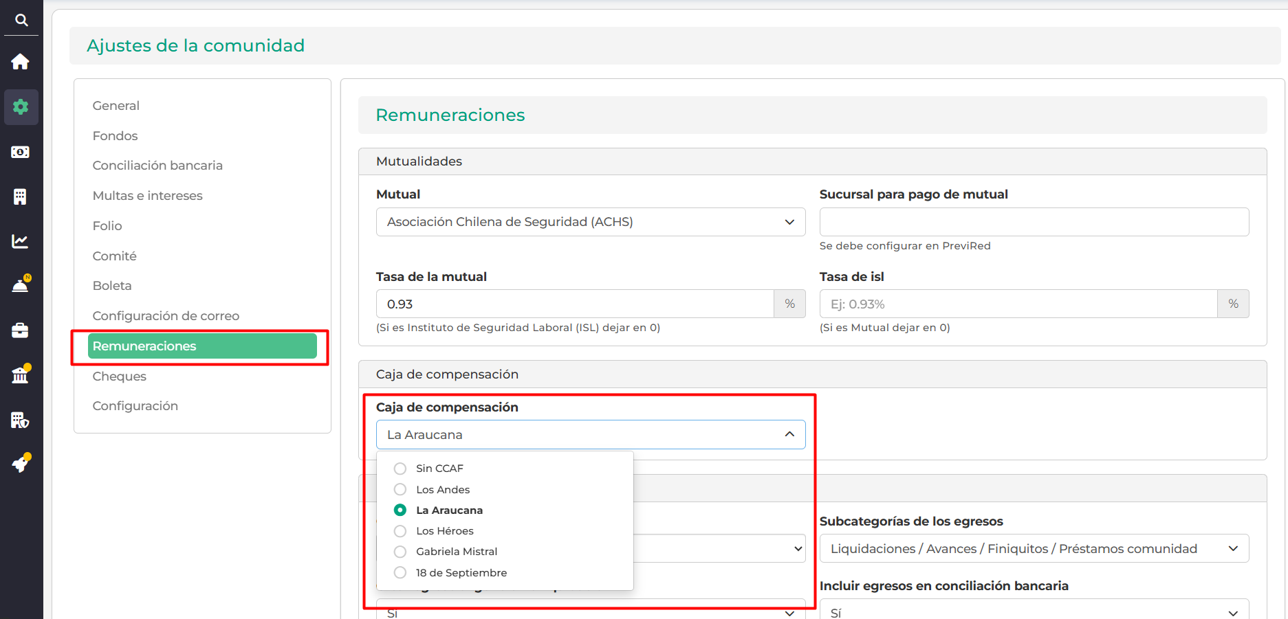 - Haz clic en Remuneraciones , luego selecciona la caja de compensación que tiene la comunidad.