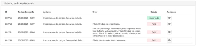 Estado “Falló”: existen errores, el detalle indica la fila y el problema.