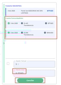 Es posible conciliar una única transacción bancaria con dos o más registros dentro de Comunidad Feliz.