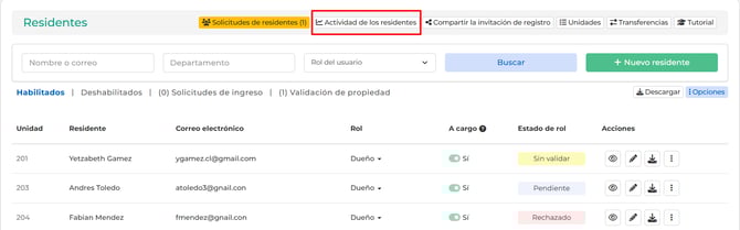 Después selecciona la pestaña “Actividad de los residentes” ubicada en la parte superior de la pantalla.