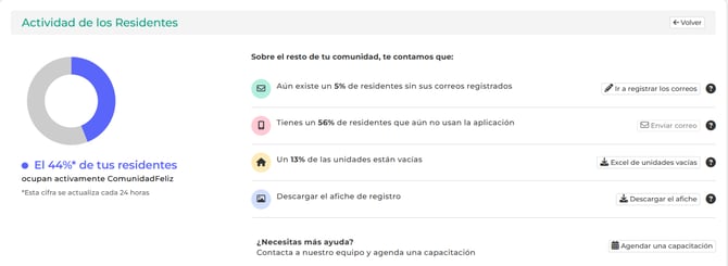 👉 Esto significa que no podrán recibir notificaciones ni acceder a la app. Te recomendamos completar esos datos cuanto antes.📱 56% de los residentes no usan la aplicación aún