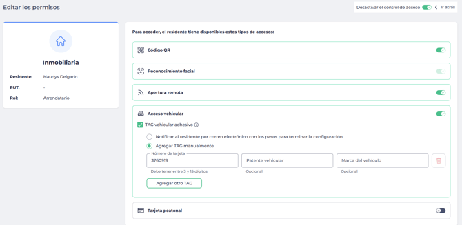 Se pueden registrar hasta 15 TAG por residente. Una vez registrados los TAG, estos quedarán habilitados para abrir los accesos vehiculares asociados a sus permisos.