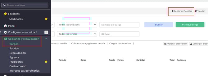 Ingresa a Cobranza y recaudacion > módulo cargo> gestionar plantilla: