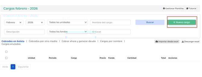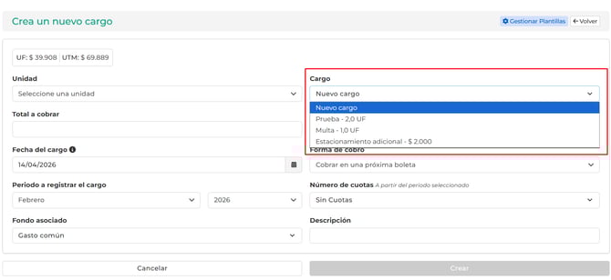 💡 Tip rápido: Puedes consultar los valores de referencia (UF/UTM) en cualquier momento dentro de la ventana de "Nuevo cargo", ubicados en la parte superior izquierda de la pantalla.