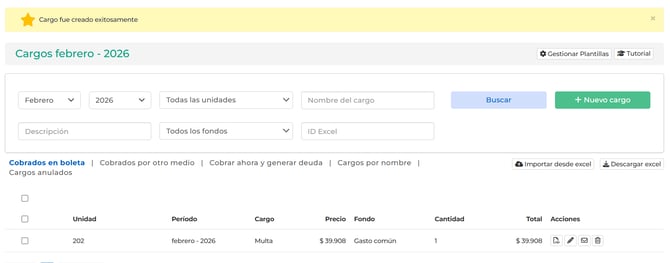 El sistema te llevará al módulo principal donde podrás visualizar el cargo recién generado con toda la configuración de la plantilla aplicada.