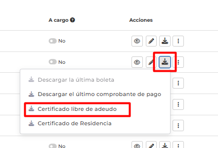 - Luego en el ítem "Acciones", en el botón de descargar. Finalmente clic en la opción deseada y descarga el certificado de libre adeudo
