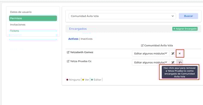 Tendrás la vista de los distintos perfiles, donde podrás en cualquier momento editar los permisos (haciendo clic en el nombre de la persona) o anular el perfil (haciendo clic en la X roja).