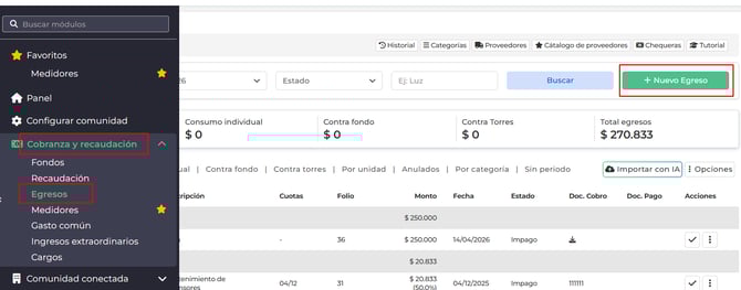 Cobranza y Recaudación > Egreso> +Nuevo egreso
