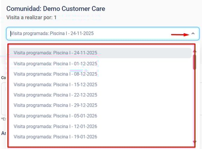 Al ingresar al enlace, tu proveedor visualizará un formulario donde podrá seleccionar la visita programada que está realizando, agregar comentarios y adjuntar cualquier archivo necesario antes de enviar la información