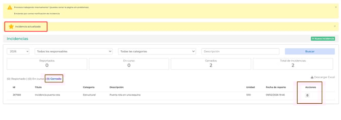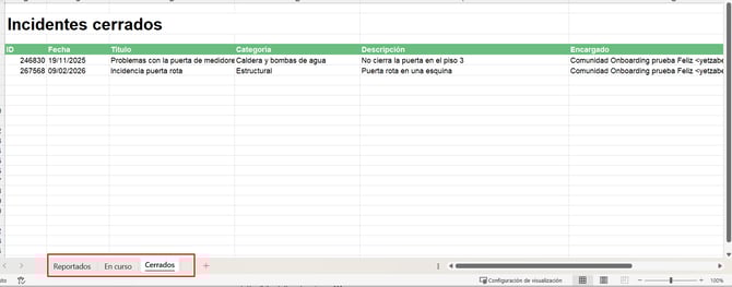 La opción Importar Excel te permite visualizar todas las incidencias junto a sus estados (reportados, en curso, cerrados en un solo archivo.