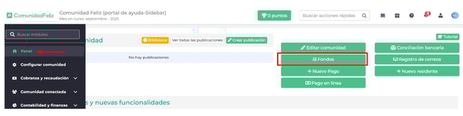 1. Acceder al módulo Panel y en los botones de la esquina superior derecha dar clic sobre Fondos.