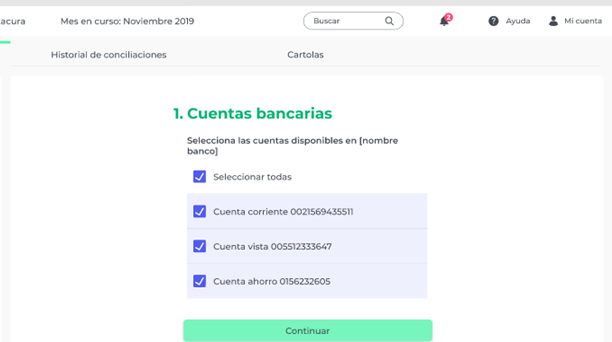 Seleccionar las cuentas que quiere ver las transacciones. No hay límites en cantidad de cuentas a asociar.