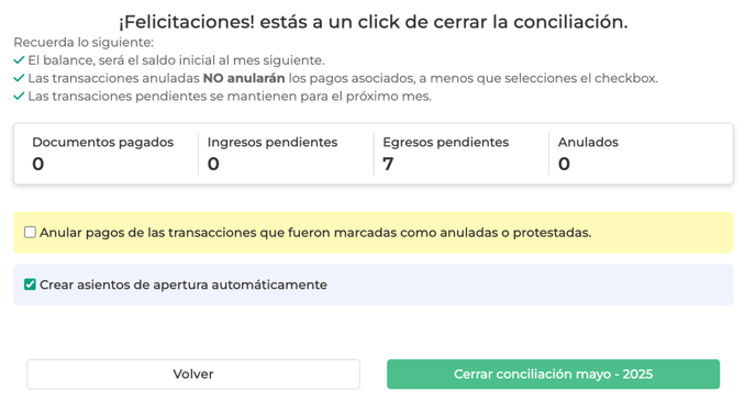 Confirmar el cierre. Al cerrar la conciliación con el checkbox activado, el sistema generará automáticamente los asientos de apertura.