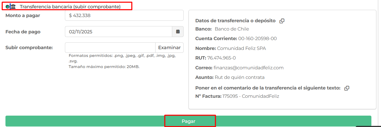 - Pinchar "Transferencia o depósito (subir comprobante)"