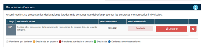 - Ahora nos posicionamos sobre Declaración Jurada con código 1887 y a mano derecha pincharemos en Declarar.