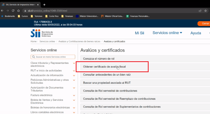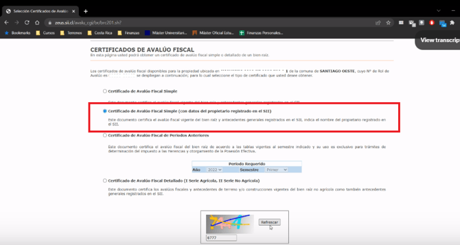 7️⃣ En las opciones que aparecen, selecciona Certificado de Avalúo Fiscal Simple(Con datos del propietario registrado en el SII).