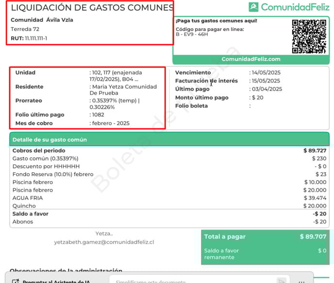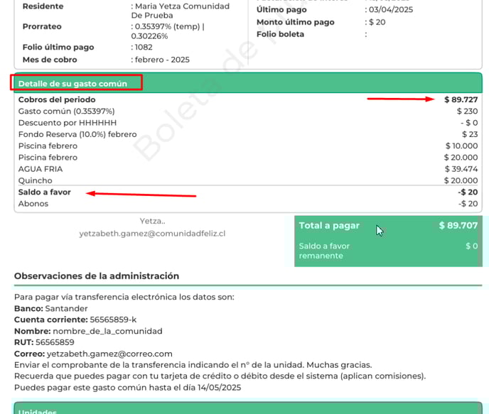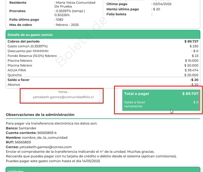 Importante: Los detalles de la boleta pueden variar según las configuraciones habilitadas en Editar Comunidad / Boleta.