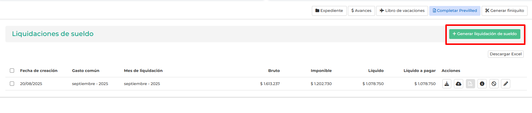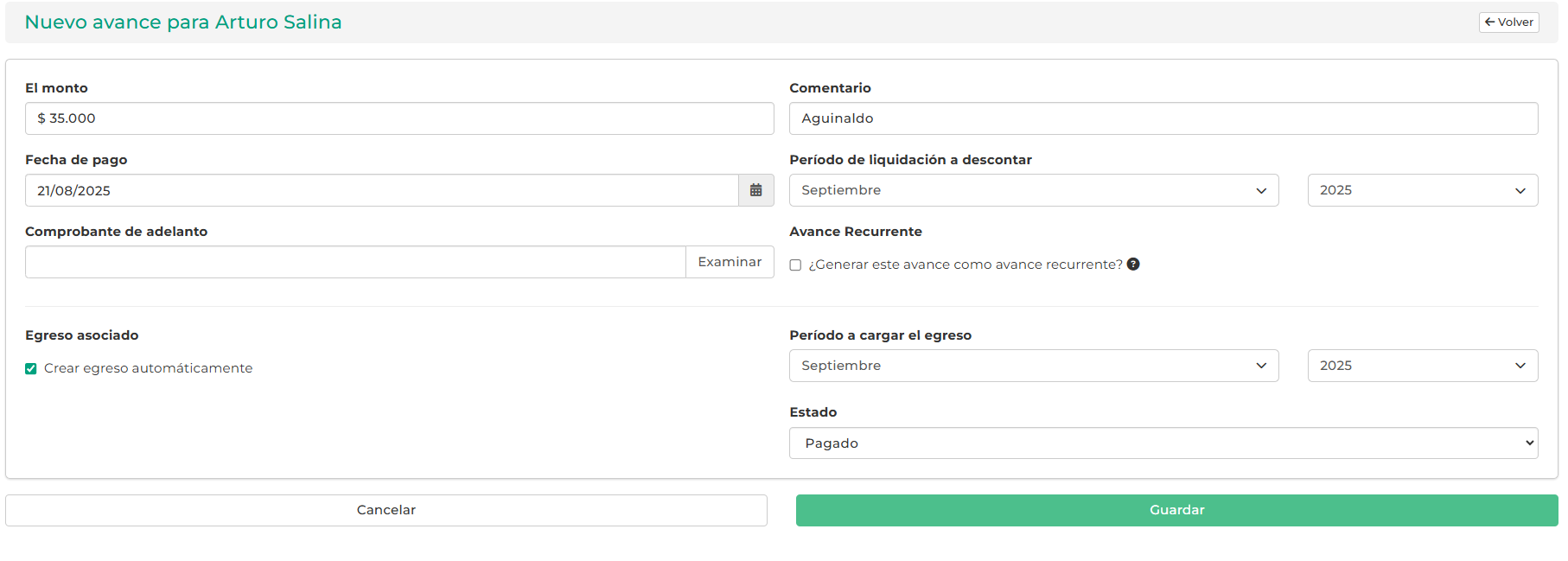Una vez creado el avance, el siguiente paso es agregarlo a la liquidación.