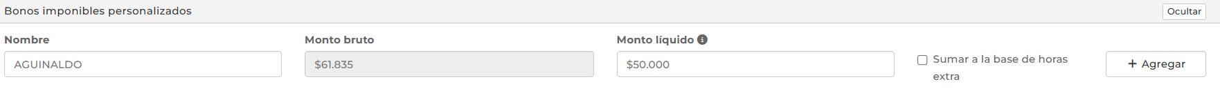 Opción 2: En la sección Bonos imponibles personalizados, ingresa "Aguinaldo" en la casilla "nombre". Luego, ingresa el monto líquido en la casilla "monto liquido"; el campo del monto bruto se rellenará automáticamente. Para finalizar, presiona el botón "agregar".