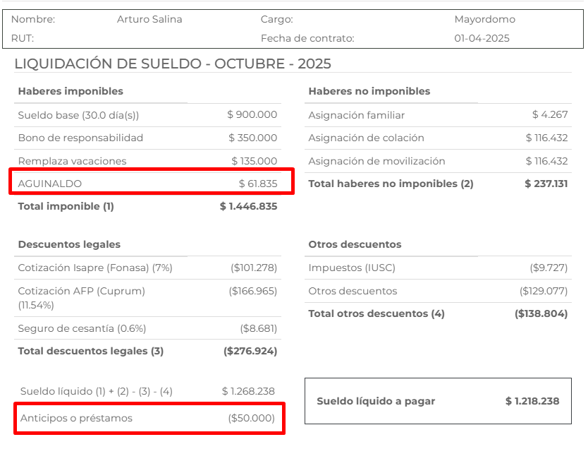 Para registrar un aguinaldo, es necesario realizar dos pasos: primero, crear el avance y, luego, agregarlo a la liquidación de sueldo del trabajador.