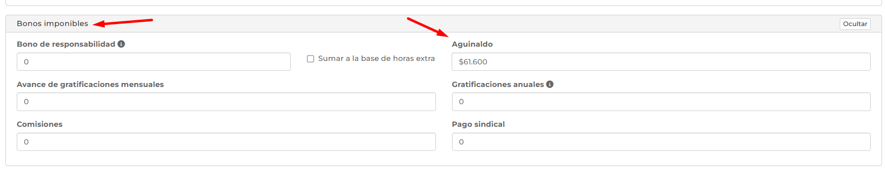 Opción 1: En la sección Bonos Imponibles, ingresa el monto bruto del aguinaldo en la casilla "Aguinaldo".