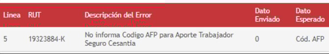 No informa código AFP para Aporte Empleador Seguro Cesantía