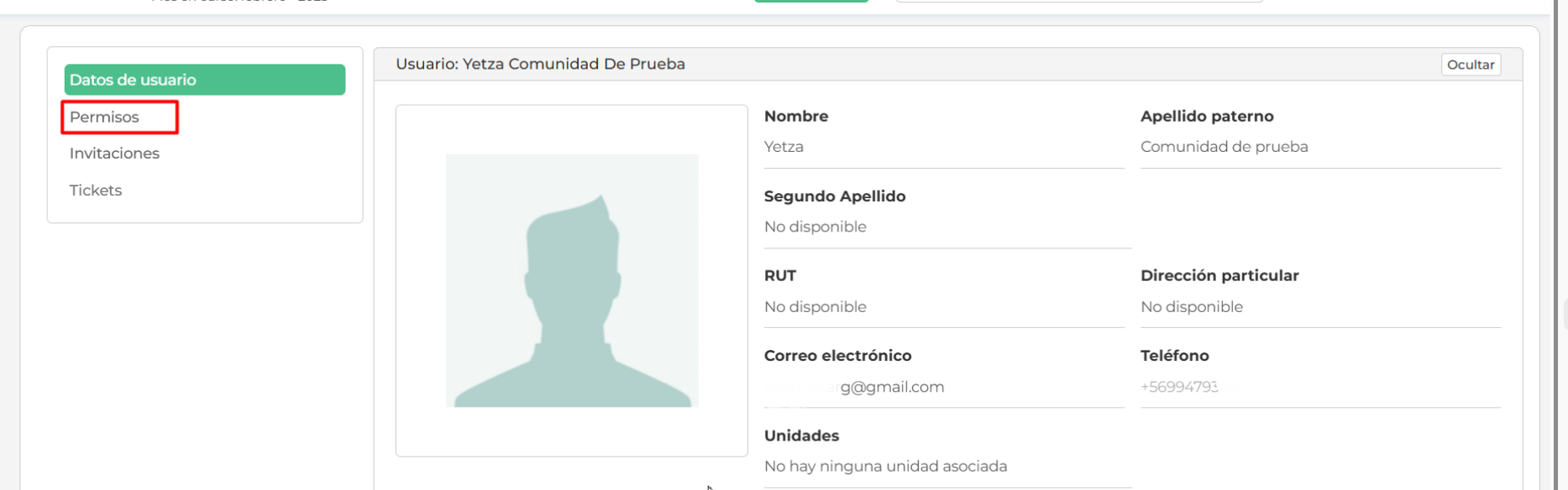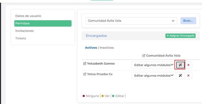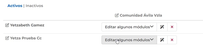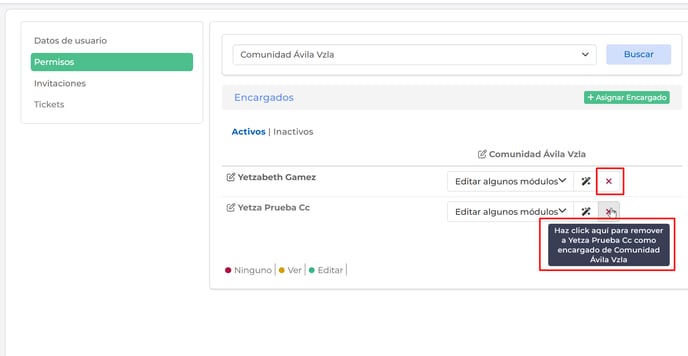 Tendrás la vista de los distintos perfiles, donde podrás en cualquier momento editar los permisos (haciendo clic en el nombre de la persona) o anular el perfil (haciendo clic en la X roja).