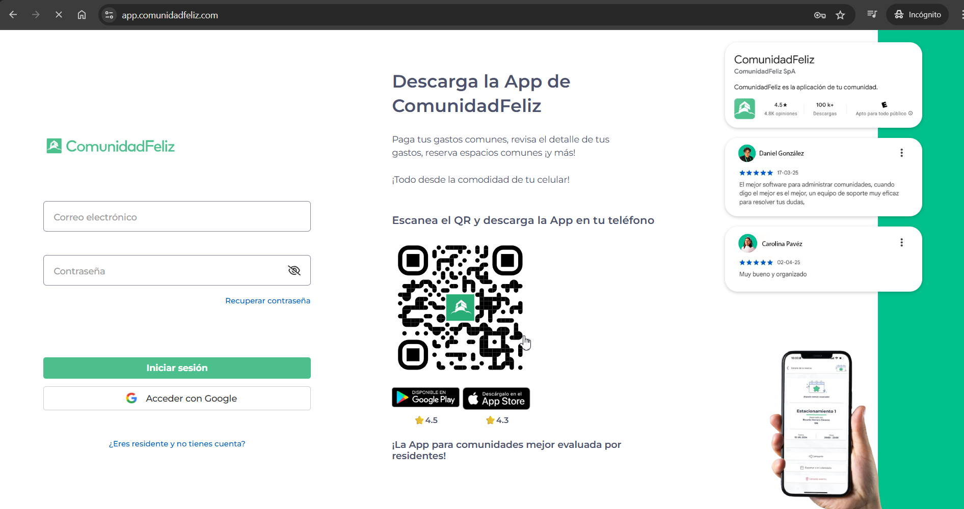 Accede a app.comunidadfeliz.com con tu usuario y contraseña.