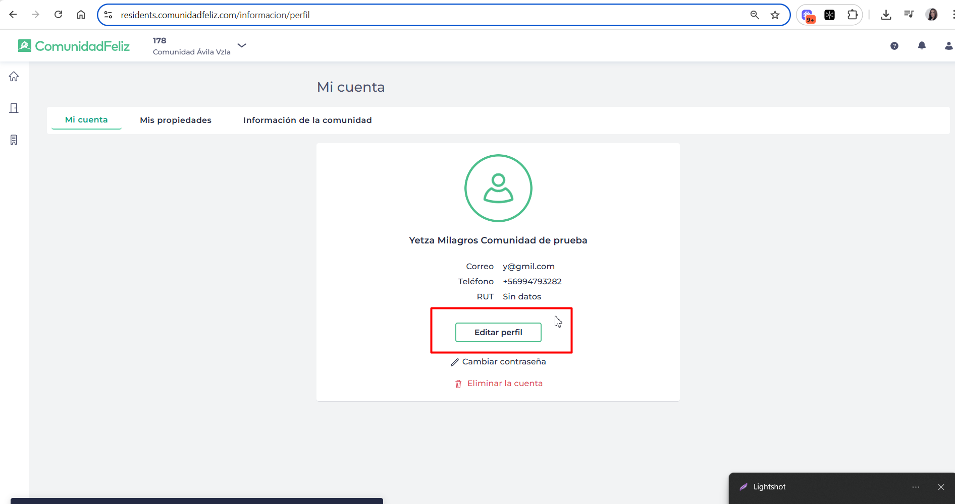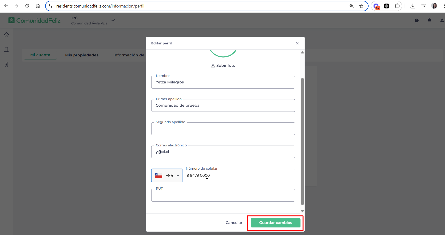 Permite que los residentes actualicen sus datos personales (nombre, RUT, correo o teléfono) de forma autónoma, asegurando que la información registrada en la plataforma esté siempre correcta y actualizada para una mejor comunicación.