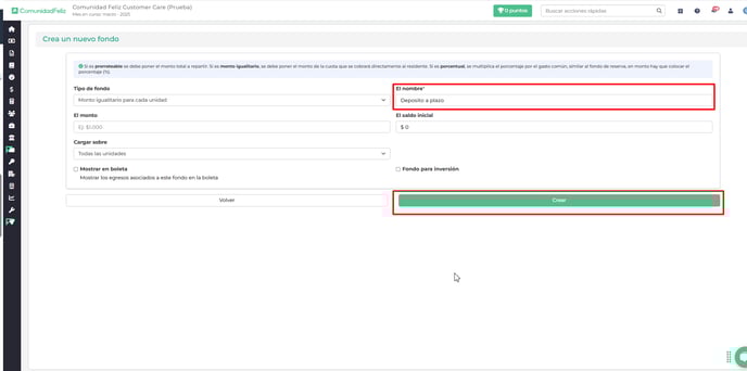 4. Acá deberás escribir solo el Nombre del Fondo. No cambies, ni agregues nada más. Por último, haga clic en el botón verde Crear.