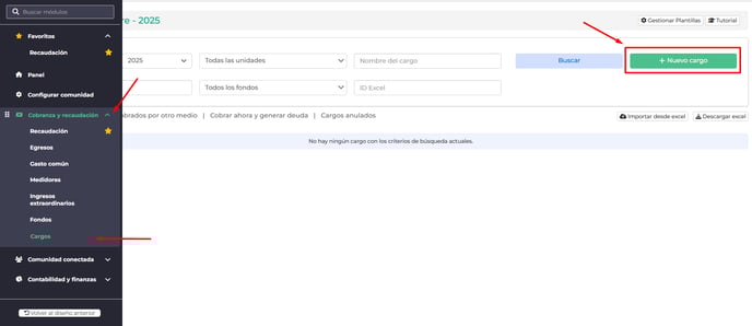 Al ingresar en el módulo de Cobranza y recaudación y luego en Cargos tendrás la siguiente vista, haz clic en + Nuevo cargo.