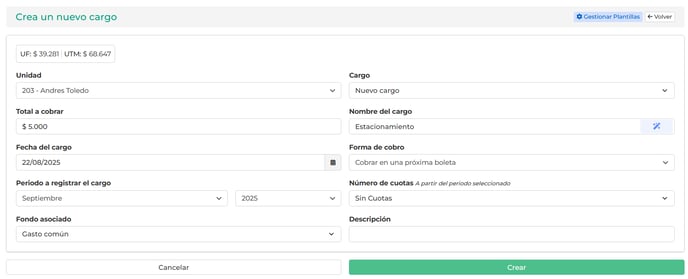 Si selecciona una plantilla previamente creada, tendrás una casilla para ingresar la Cantidad y el Total a cobrar ya indicará el valor del cargo.