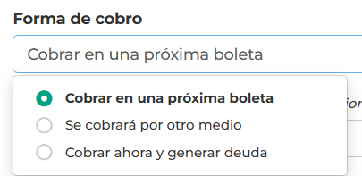 - Cobrar ahora y generar deuda: El cobro se imputará de forma inmediata en el saldo de la unidad, este se verá reflejado en la cartola de cuotas de mantenimiento y pagos, si se le notifica el copropietario recibirá un aviso o correo con este cargo.