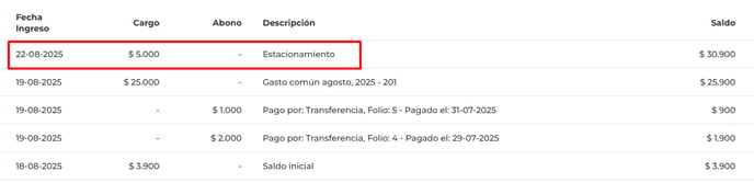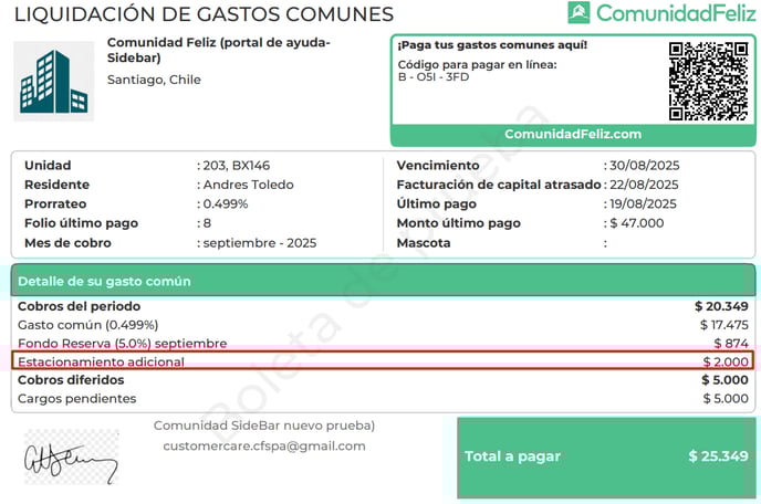 - Cobrar en una próxima recibo: El cobro se verá reflejado en la estado de cuenta, saldrá con el nombre indicado y en la sección de Cobros del período. Además el copropietario recibirá una notificación en el panel de su cuenta.